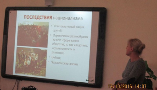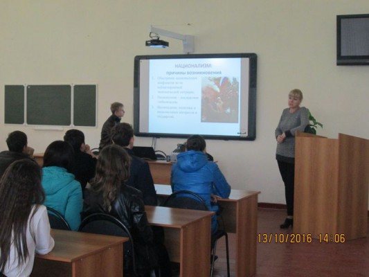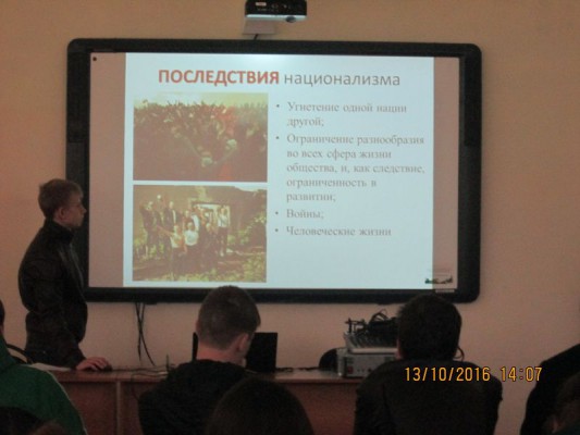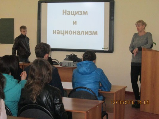 Всего 70 лет назад мир захлестнула сокрушительная война, но уже сегодня последователи Гитлера заявляют о своих претензиях на политический олимп. Они пытаются прорваться в парламенты и кабинеты министров под видом националистов, утверждая, что на самом деле оберегают интересы народа. Чем же они отличаются от нацистов? Есть ли риск повторения войны, которая вновь заставит вздрогнуть всё человечество? Об этом и многом другом говорили 13.10.2016 г. на классных часах руководители групп Эт-52 (Измалкова Е.В.), Эт-53(Савченко Н.О.), К-42 (Измалков М.С.), Л-21 (Рязанская О.Б.), Л-22 (Воронина И.И.), Эн-34 (Иорданиди Н.Д.), Т-32 (Беркова С.В.) в рамках реализации воспитательной программы гражданско-патриотического воспитания целью которой является формирование современного цивилизованного человека, гражданина своей страны, воспитание чувства гуманности, уважения и сопереживания.