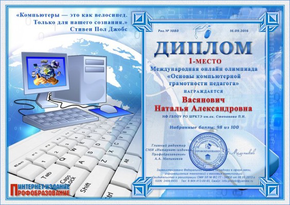 2. Международная онлайн олимпиада "Основы компьютерной грамотности педагога" (Васянович Наталья Александровна - 1 место)