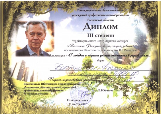 16 марта 2017 года в Новошахтинском индустриально-технологическом техникуме прошел территориальный литературный конкурс «Валентин Распутин: вчера, сегодня, завтра».