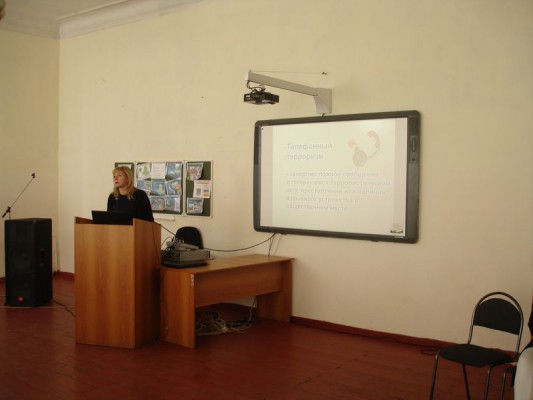 Методист Кононова И. Л., преподаватели Радченко С.А., Рязанская О.Б., Шабунина М.А., педагог-психолог Воронина И.И. организовали для студентов 1-х курсов круглый стол, в ходе которого познакомили их с сущностью террористических актов с применением химического оружия, особенностями поведения во время терактов, с ответственностью, предусмотренной законом за ложную информацию о террористических актах.