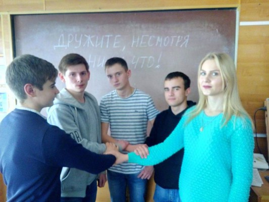 Завершилась «Неделя толерантности» большой акцией «Возьмемся за руки друзья!». Волонтёры отряда «Добрые сердца» в течении дня раздавали разноцветные ленточки как символ того что мы все разные, но как важно быть единым целым, быть терпимее, добрее друг к другу. После этого обучающиеся и преподаватели вышли на площадку, взявшись за руки и громко скандировали: «Возьмемся за руки друзья, и будем добрыми всегда!».