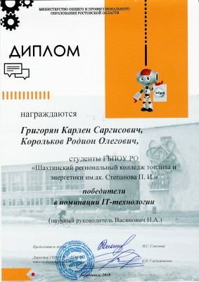Под руководством преподавателя Васянович Н.А. обучающимися 3 курса специальности «Компьютерные системы и комплексы» Корольковым Родионом и Григорян Карленом была разработана электронная лаборатория для самостоятельной работы студентов, которая заняла 1 место.