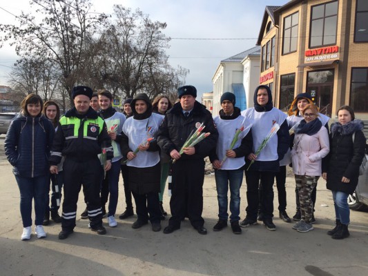 В преддверии Международного женского дня специалисты отдела по работе с молодёжью Управления образования Администрации города совместно с инспекторами ОГИБДД отдела МВД России по г. Новошахтинску и обучающимися гр. К-43 Корольков Р., Кармеев Р., гр. К-41 Волков М., Шкирман Е.., гр. Эт-54 Бандурин Д., гр. Л-21 Дронова Е. состоящими в добровольной молодежной дружине и волонтерами города организовали и провели традиционную городскую акцию «Дарите женщинам цветы!».