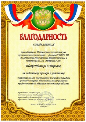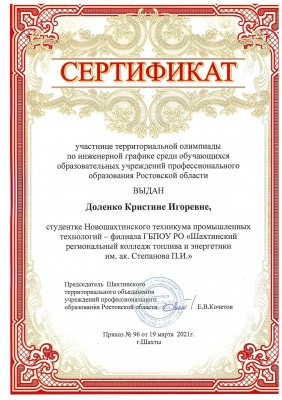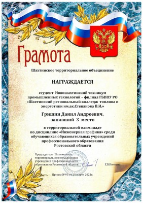 19.03.2021 в ГБПОУ РО «ШРКТЭ им.ак. Степанова П.И.» состоялась территориальная олимпиада по дисциплине «Инженерная графика» среди обучающихся средних профессиональных образовательных учреждений Ростовской области. Студенты нашего учебного заведения гр.ТЭО-21 Гришин Данил и гр.КСК-21 Доленко Кристина, под руководством преподавателя Швец Т.П., приняли участие в этой олимпиаде. Гришин Данил показал хорошие знания и умения в области ручной графики и занял призовое 3-е место.