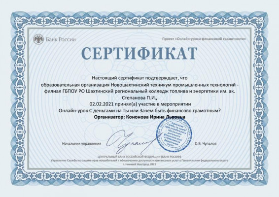 В марте завершающим этапом в данном направлении являлось участие студентов в весенней онлайн - сессии по финансовой грамотности: «С деньгами на ты»; «Зачем быть грамотным»; «Личный финансовый план. Путь к достижению цели»; « Пять простых правил, чтобы не иметь проблем с долгами», где обучающиеся и преподаватели получили сертификаты.