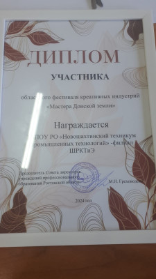 11 октября 2024 года на базе ГБПОУ РО «Новошахтинский технологический техникум» проводился Областной Фестиваль креативных индустрий «Мастера Донской земли», в котором приняли участие преподаватели Никитченко О.С., Михайличенко Н.С. и обучающиеся группы ПО-41 Кузьменко Арсентий, ПО-31 Чернейкина Анна, Макеев Иван.